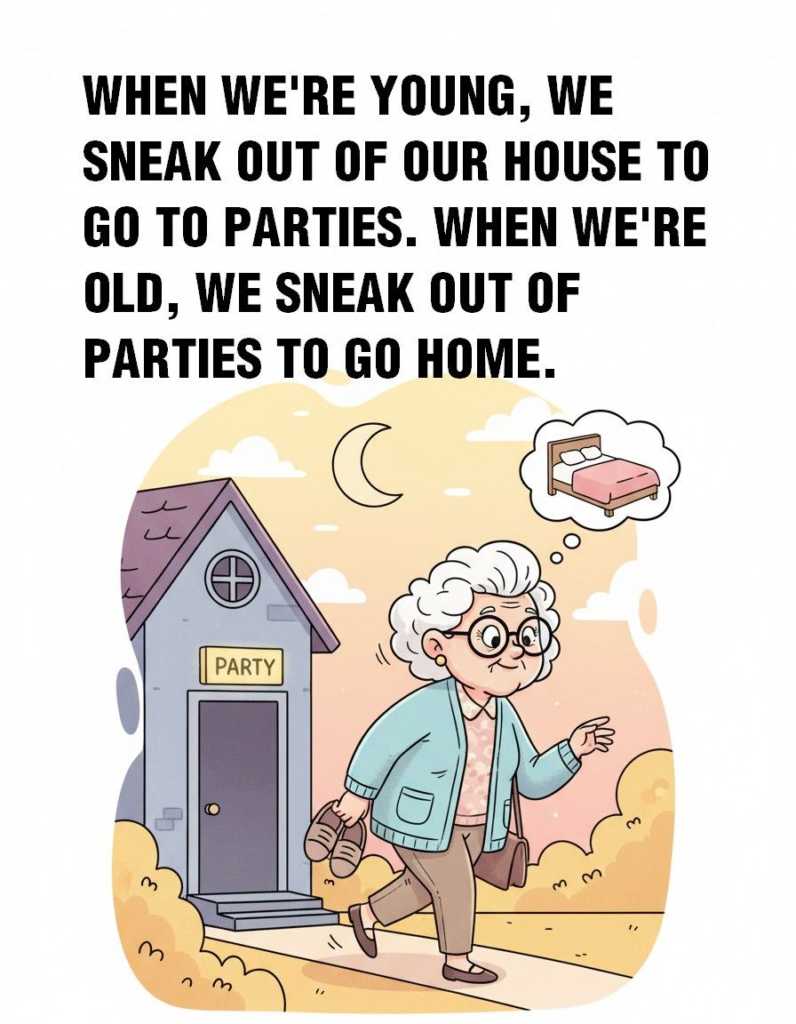 The fun of laughter is in laughing at yourself. Age is just a number and happiness has nothing to do with age. So let’s enjoy life. Stay positive and enjoy life no matter how tired we are. A good laugh makes every day brighter and more enjoyable. Growing old is a part of life but with humor it becomes a wonderful journey.