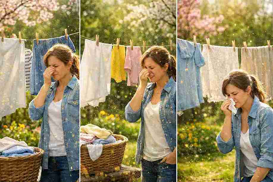“Drying clothes outdoors during spring may expose them to airborne pollen that can trigger allergies.”