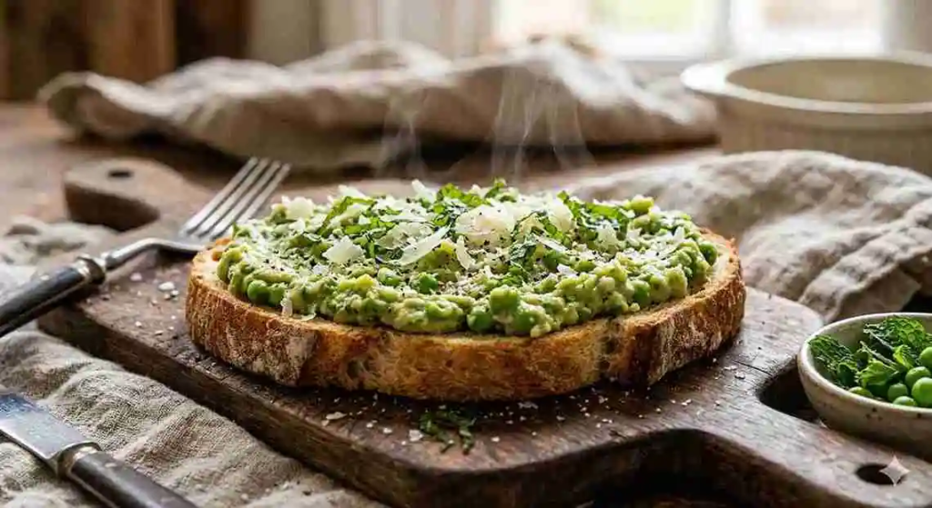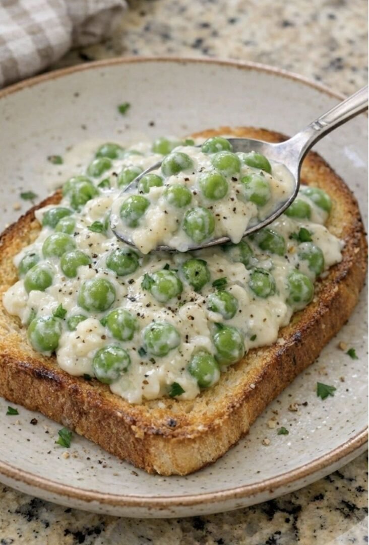 - Assemble & Serve: Spoon creamy peas over toast. Garnish with herbs or grated parmesan. Serve warm.
