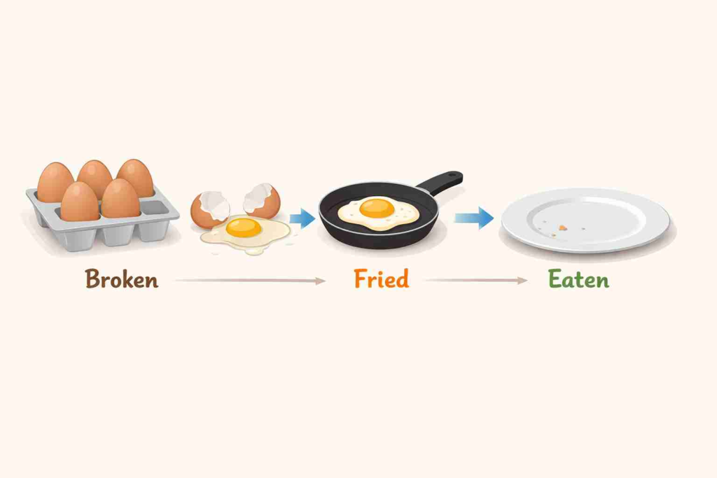 The riddle never states that these were all different eggs. In reality, you cannot fry an egg without breaking it first, and you cannot eat it unless it’s cooked. This means the same eggs were involved in all three actions.