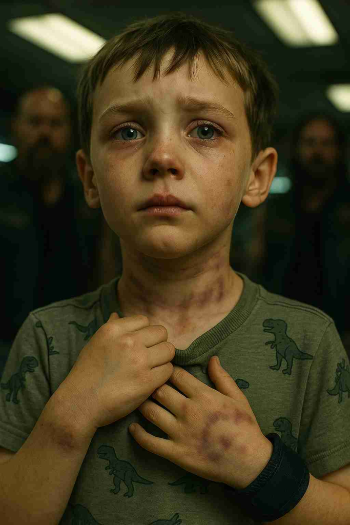 She attempted to draw Tyler away, but as she held his hand the makeup on her wrist smudged and he was found to have bruises of the same color. Her eyes were dashing about the room. “We should go. Come on, baby.”